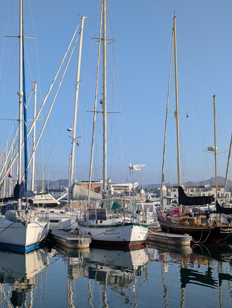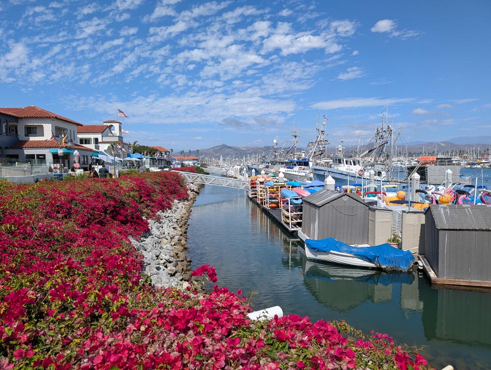 The colorful Ventura harbor, now a commercial enterprise full of ships and shops |