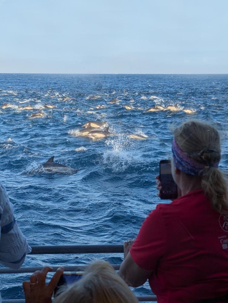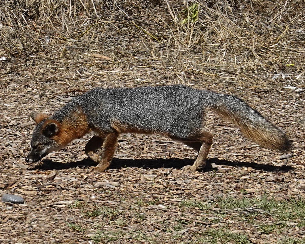 | DAY 6. We drove right to the outfitters early where we wound up waiting for an hour before boarding. But it was fun looking around and talking to fellow hikers. The hour ride over was scenic, balmy and we even spotted a few whales. The island had a small museum and restrooms, which we took advantage of, and then headed up the hill on the shortest most scenic hike due to not knowing how Mimi's ankle would hold up. On the way a group of Road Scholar people befriended us and offered to help Mimi out in any they could. One of the older gentlemen was particularly attentive. How nice. We took it easy and enjoyed the gorgeous views and weather for the next two hours. They advised us to turn around as the trail down was rough, but it wasn't a problem if we took it easy. On getting into the valley it was a bit warmer than we cared for but a slight breeze helped. After looking over some of the unique plants we slowly headed back to the pier. There I spotted one of the indigenous foxes in the distance and started to shoot photos not realizing in 5 minutes he would trot within 30 feet of me. They are listed as a separate species, and once rare they have made a comeback that mostly ignore tourists. The ride back was one of the most memorable ever as we saw a pod of dolphins the naturalist said possibly numbered at ten thousand as he said they churned up the water clear to the horizon! |