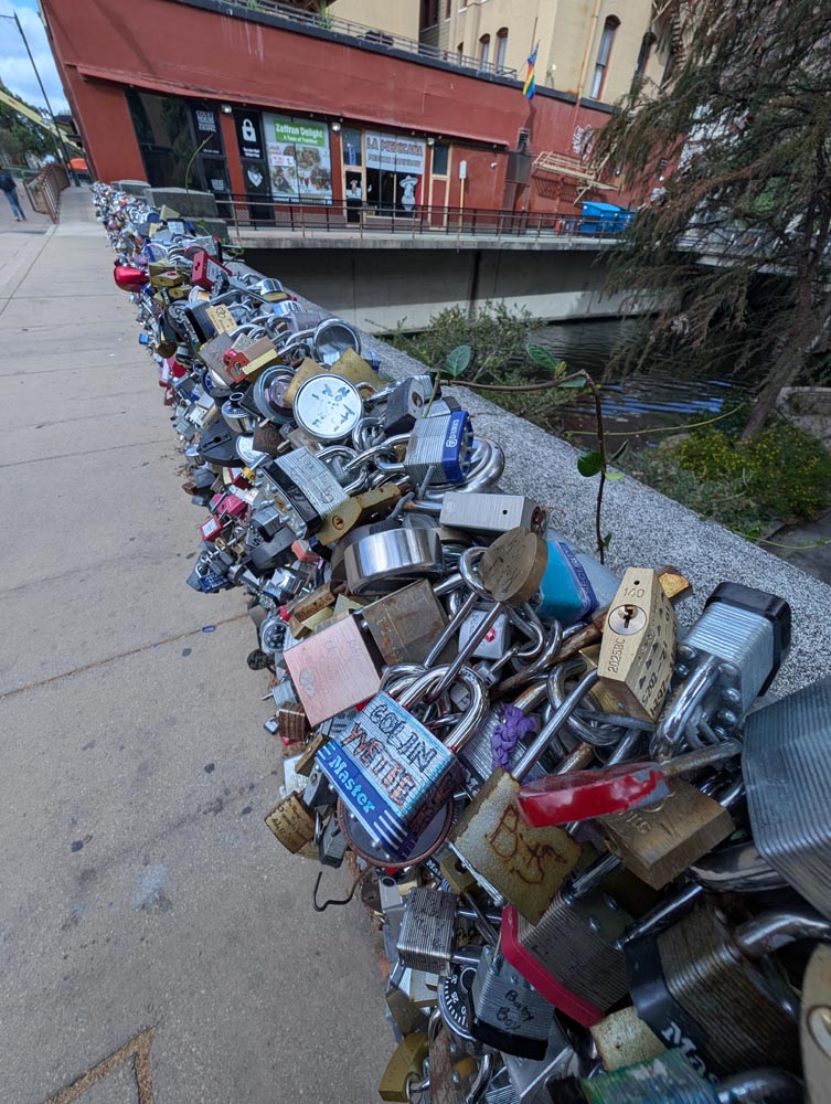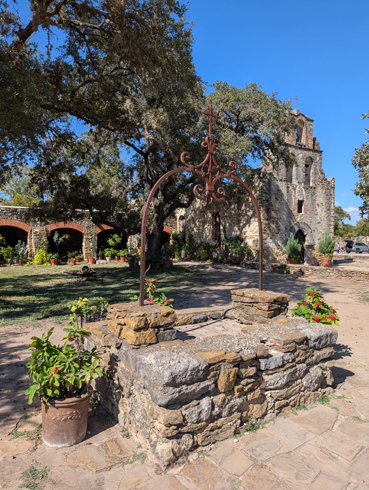 View of the mission from the well. There were so many 'love' locks on this bridge they had to reinforce it.